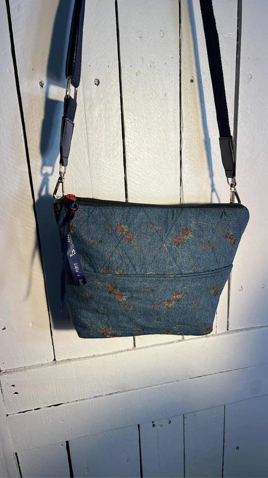 Lidia handmade lighthouse bag with up cycled denim and pocket embroidery. OOAK