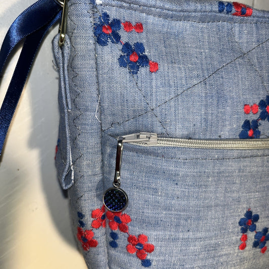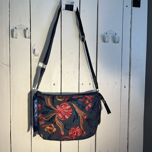 Lidia’s hand quilted navy denim handbag with floral embroidery. Crossbody.