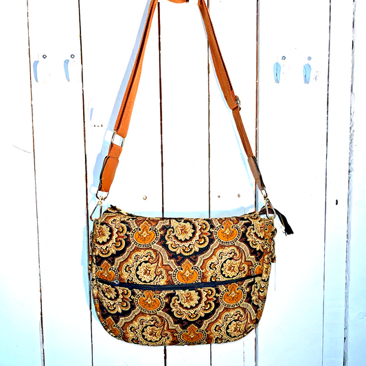 Lidia’s Handmade quilted bag with gold threads and Paisley design in browns