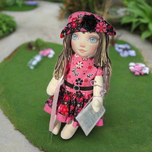 Luna Larkspur 18” Handmade Rag Doll – Cloth Doll with Floral Dress & Hat – Eco-Friendly Keepsake Gift
