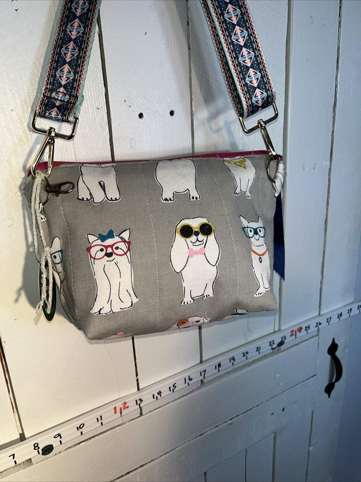 This is a unique and stylish handbag featuring a trapezoid shape with a gray exterior and a beige cotton lining. The bag has a pink handle/strap and an adjustable strap for comfort. It is handmade in the United States, making it a special and one-of-a-kind accessory for any woman's wardrobe. The design theme of the bag is centered around dogs, making it a fun and playful addition to any outfit.