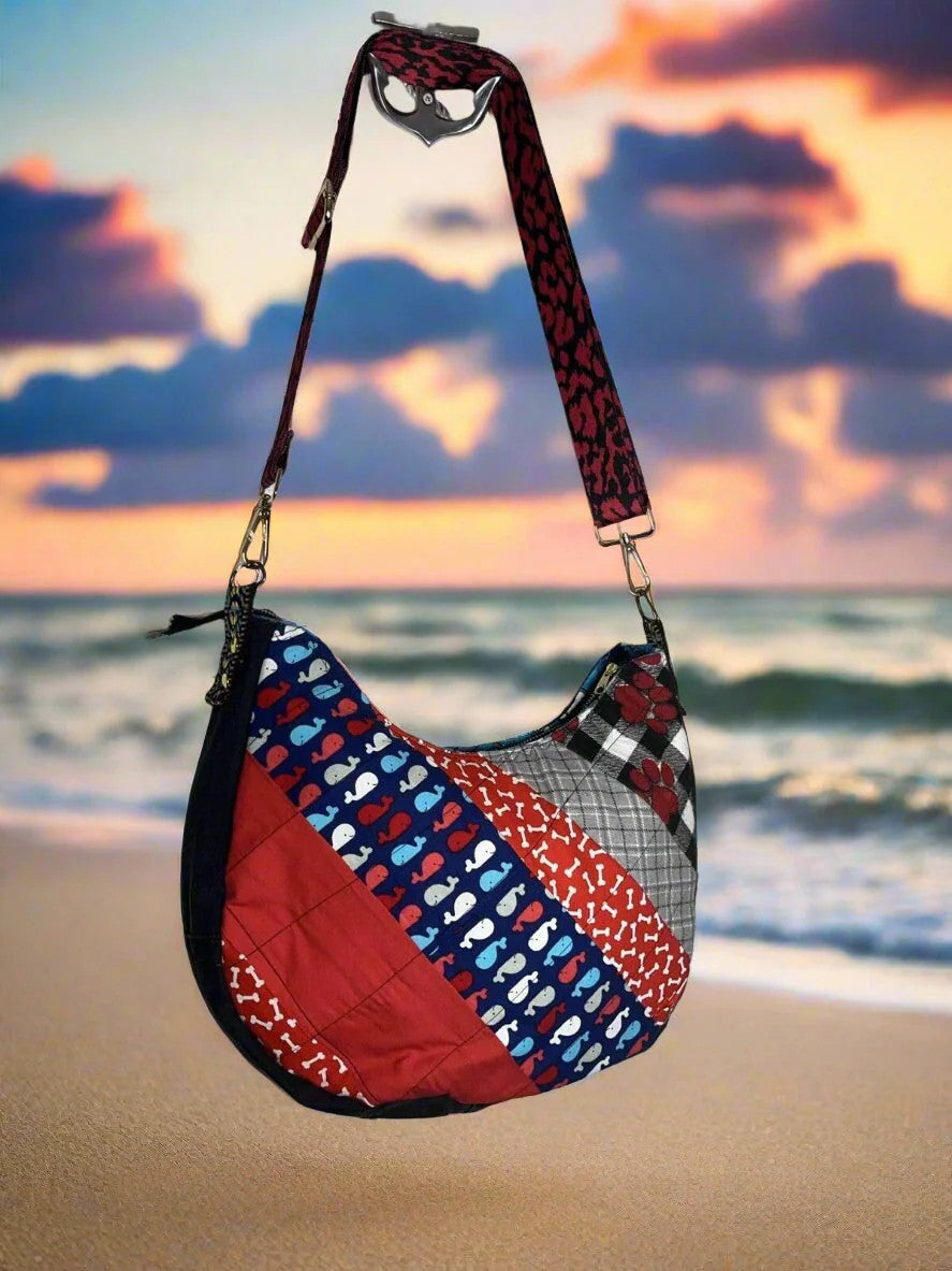 This one-of-a-kind crescent-shaped crossbody bag is a labor of love, meticulously handcrafted from vintage cotton strips and sturdy upcycled black denim. The intricate patchwork design, reminiscent of ocean waves, showcases precise craftsmanship and a commitment to sustainable fashion.