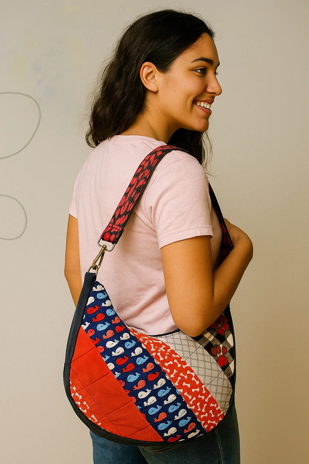 Handmade Upcycled Denim Crescent Crossbody Bag – Boho Patchwork Hobo by Lidia