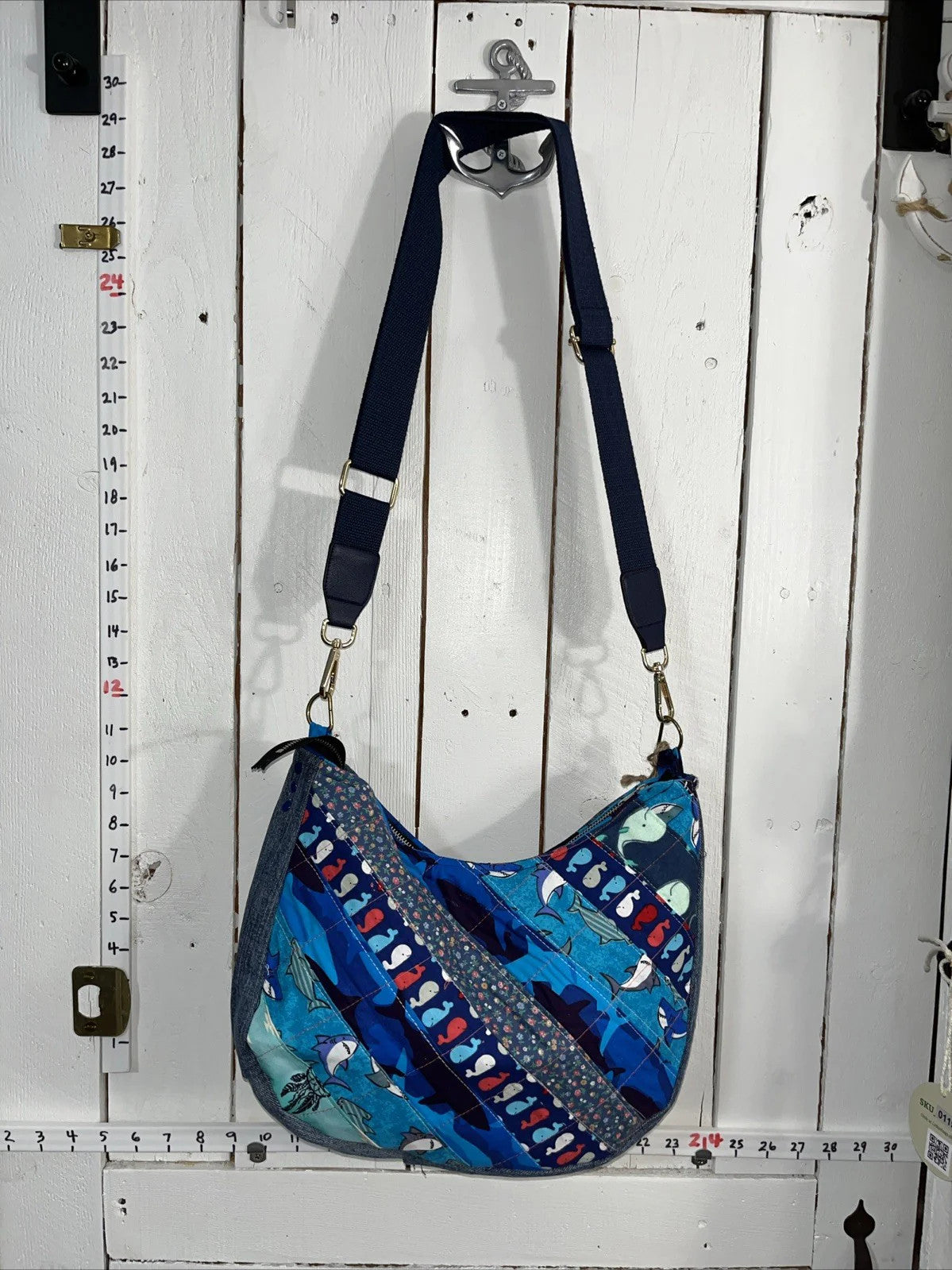 Handmade Upcycled Denim Crescent Crossbody Bag Marine Life Sharks Whales