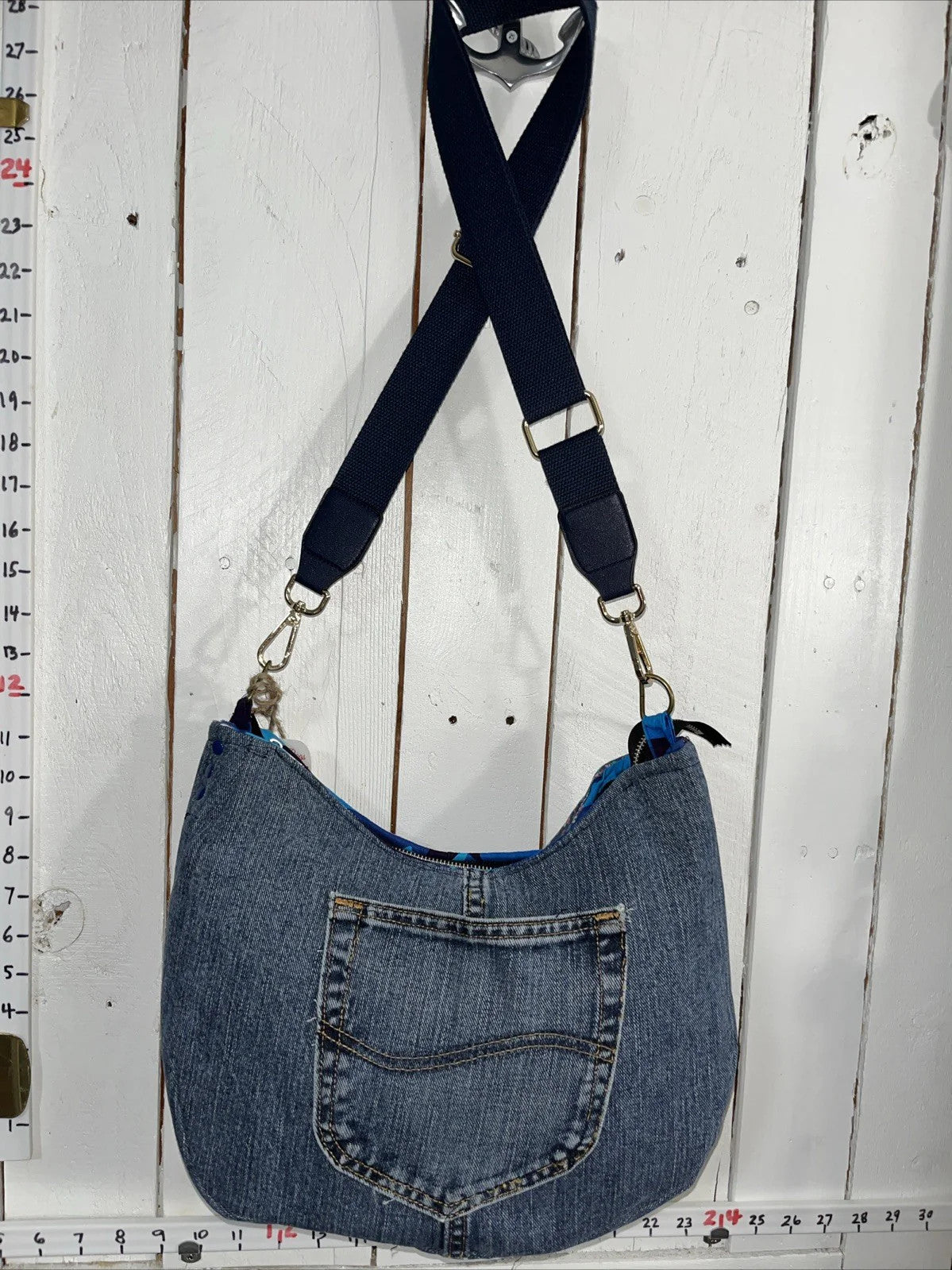 ๐ Handmade Upcycled Denim Crescent Crossbody Bag โ Boho Patchwork Hobo by Lidia