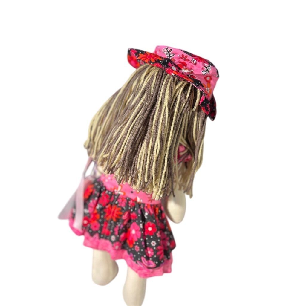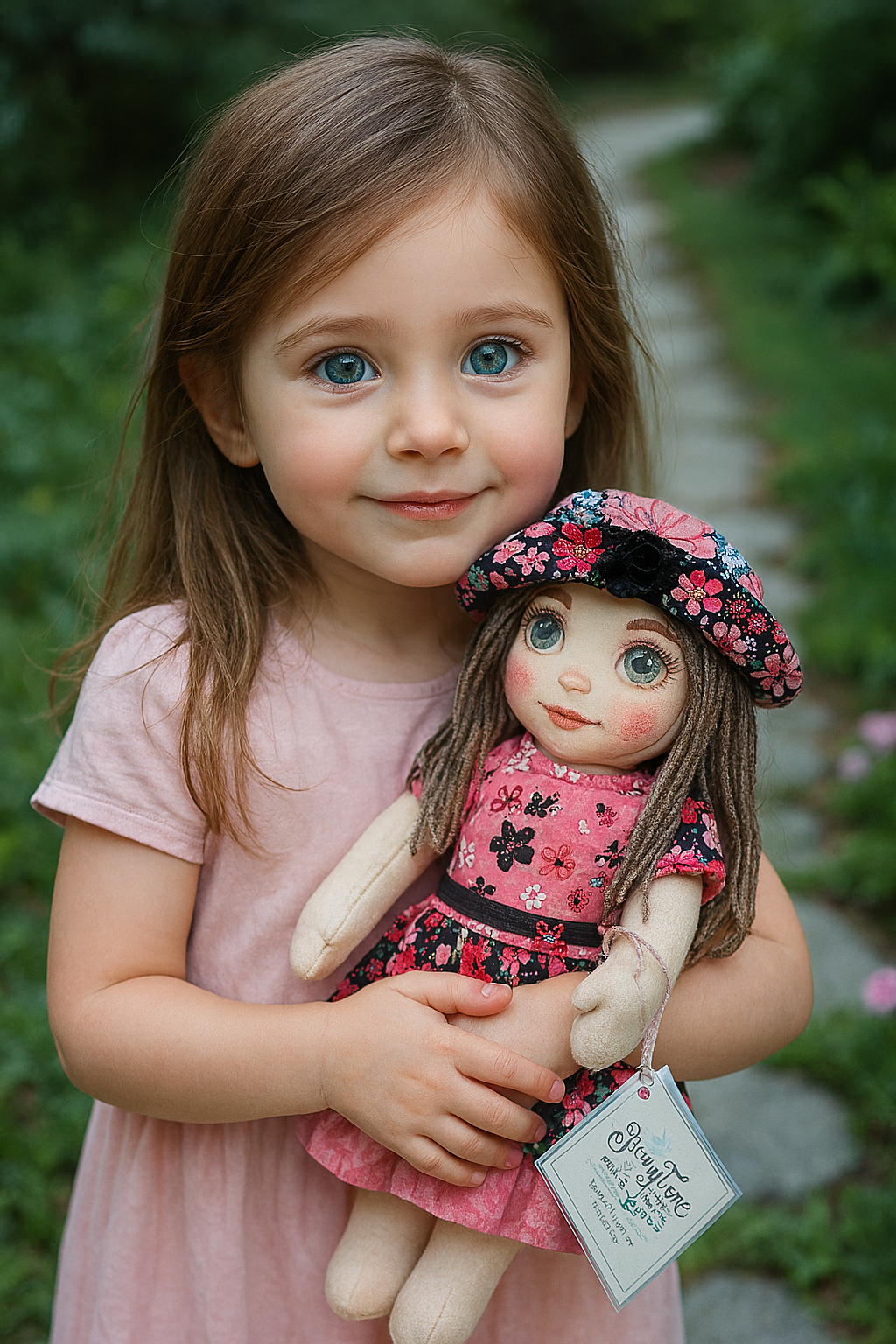 This delightful rag and cloth doll from Lidia’s Dolls Storytime Friends is a unique handcrafted creation, made with soft wool yarn hair and a cotton floral outfit featuring bold red, black, and pink patterns. Her hand-painted face gives her a gentle, expressive personality. Violet wears a matching removable hat adorned with a tiny velvet flower. Her story card is included, telling of her whimsical garden adventures — a special touch that brings this character to life.