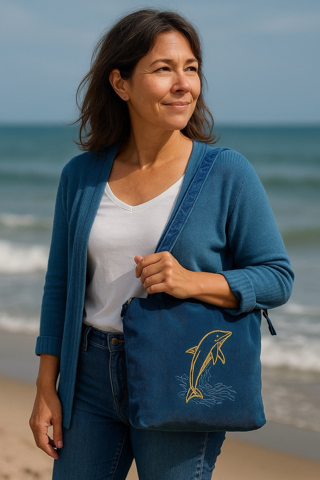 This soft, slouchy crossbody is sewn from rescued denim-blue corduroy and finished with a hand-embroidered golden dolphin leaping from the waves. It’s the kind of bag that speaks directly to people who slow down at the shoreline, breathe in the salt air, and feel something come alive when they see a dolphin break through the water.