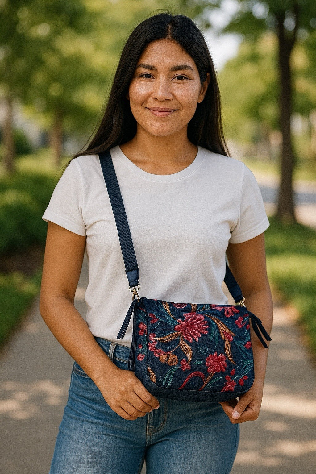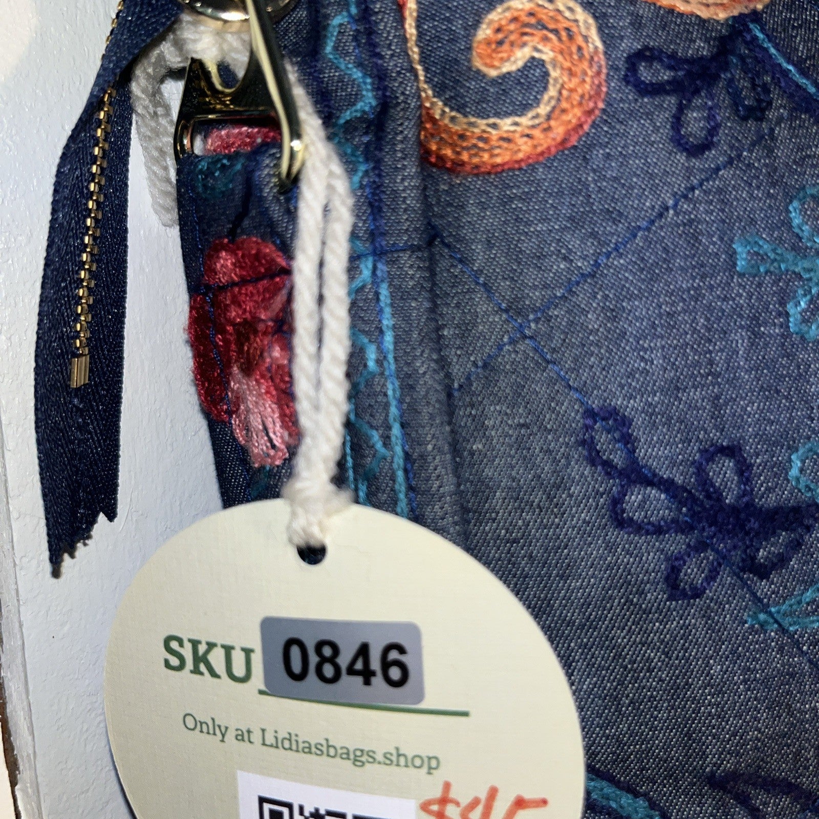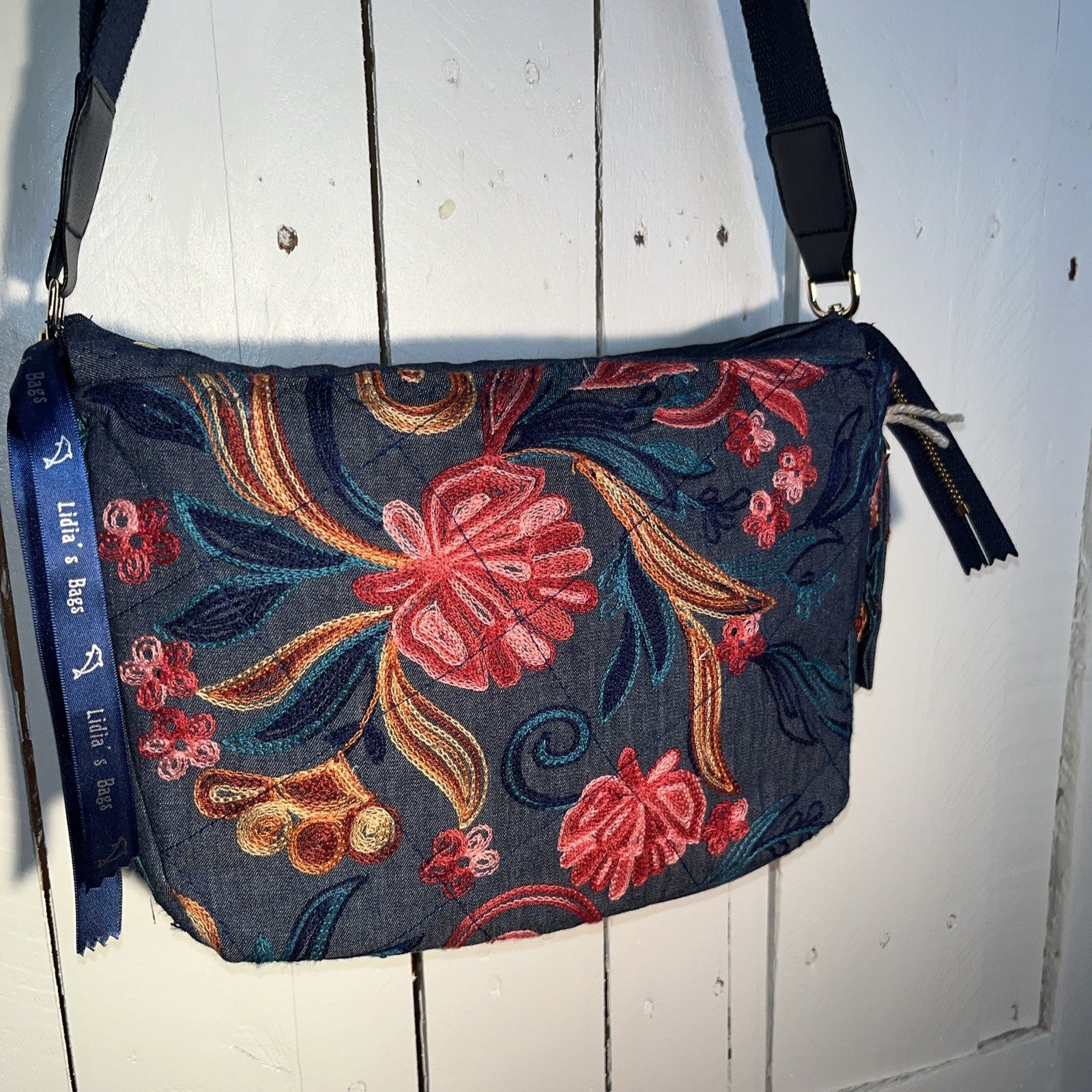 Lidia’s Handmade Embroidered Quilted Bag is a medium-sized crossbody bag with a floral pattern and black exterior. The bag features a zip closure, crossbody strap handle style, and inner pockets. Made with cotton exterior and metallic finish, this eco-friendly bag is handmade in the United States by Lidia’s bags. Perfect for women who appreciate unique and stylish accessories, this bag combines practicality with a touch of hearts-themed design.