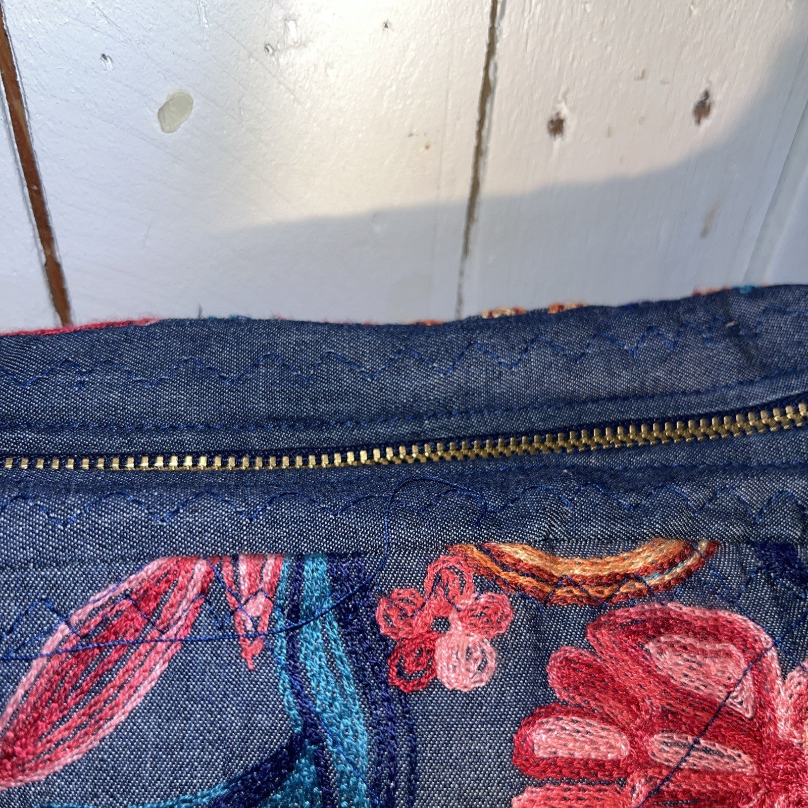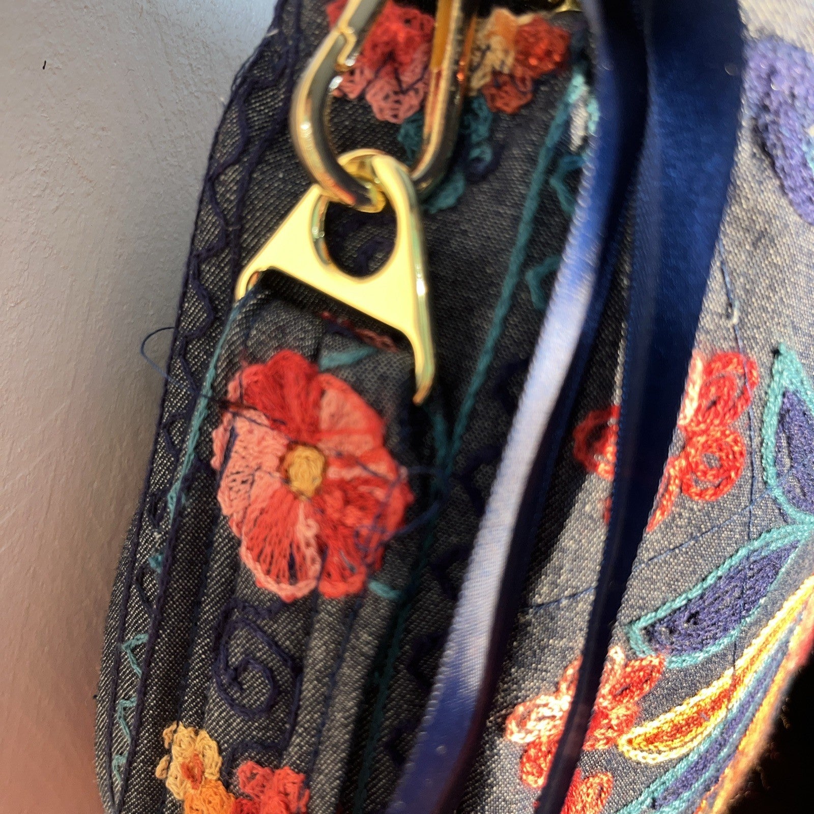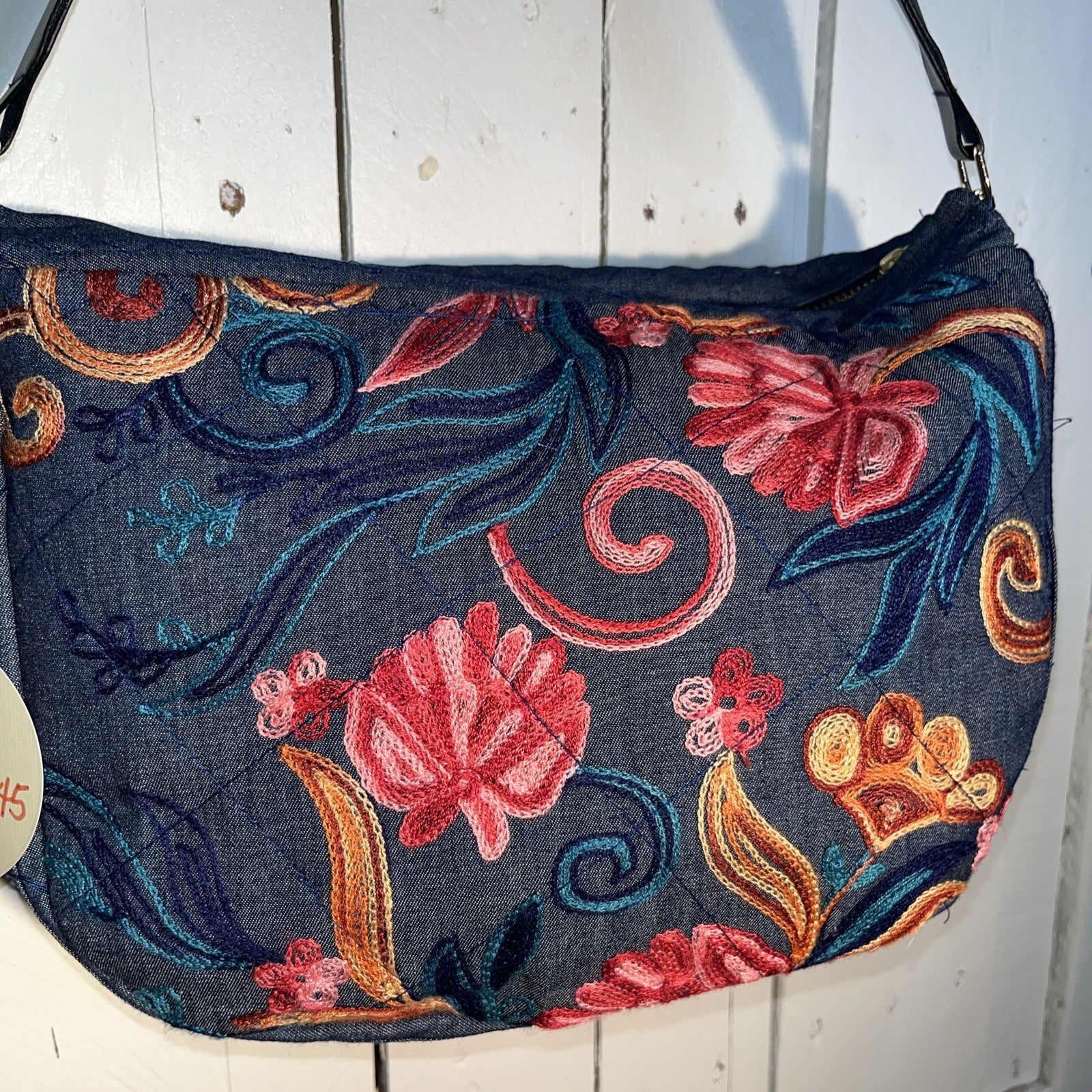 Lidia’s Handmade Embroidered Quilted Bag is a medium-sized crossbody bag with a floral pattern and black exterior. The bag features a zip closure, crossbody strap handle style, and inner pockets. Made with cotton exterior and metallic finish, this eco-friendly bag is handmade in the United States by Lidia’s bags. Perfect for women who appreciate unique and stylish accessories, this bag combines practicality with a touch of hearts-themed design.