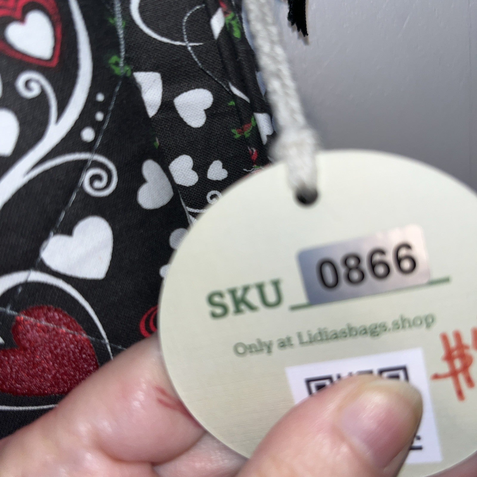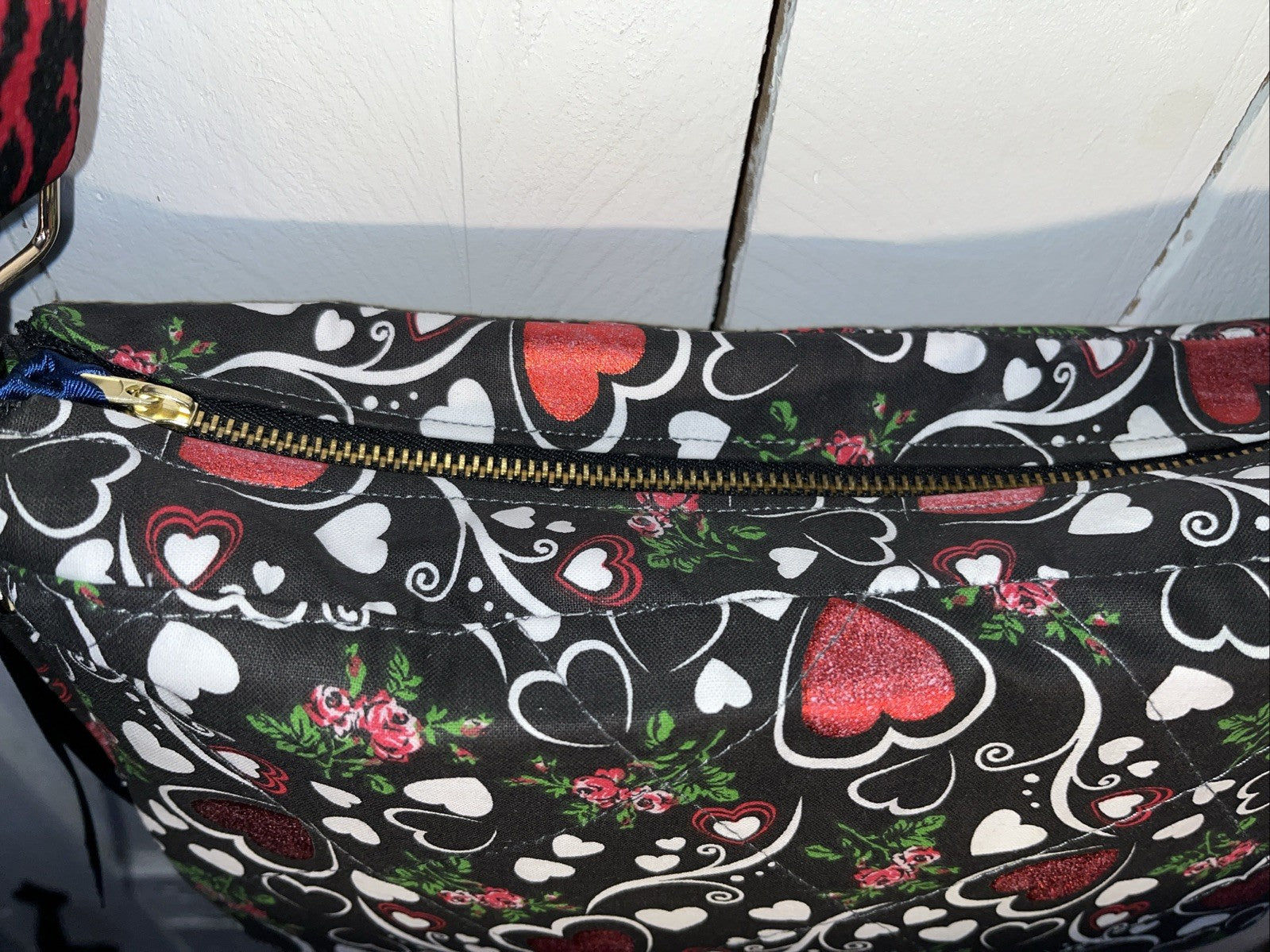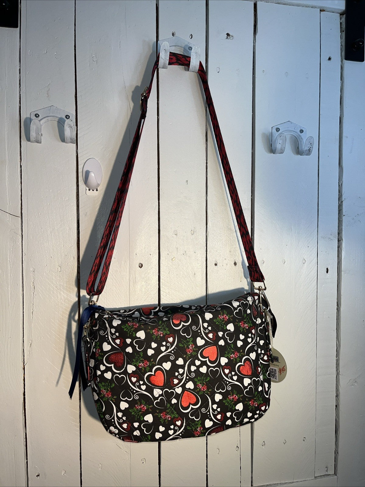 Lidia's Handmade Handbag in Metallic Hearts features a geometric pattern with a zip closure and a medium size of 10 inches in width, 8 inches in height, and 3 inches in depth. The bag is lined with cotton and made with upholstery material, making it durable and stylish. The crossbody strap adds a trendy touch to this eco-friendly handbag, along with inner pockets for organization. Designed by Lidia's bags in the United States, this handbag combines practicality with a touch of heart-themed style, perfect for any fashionable woman on the go.