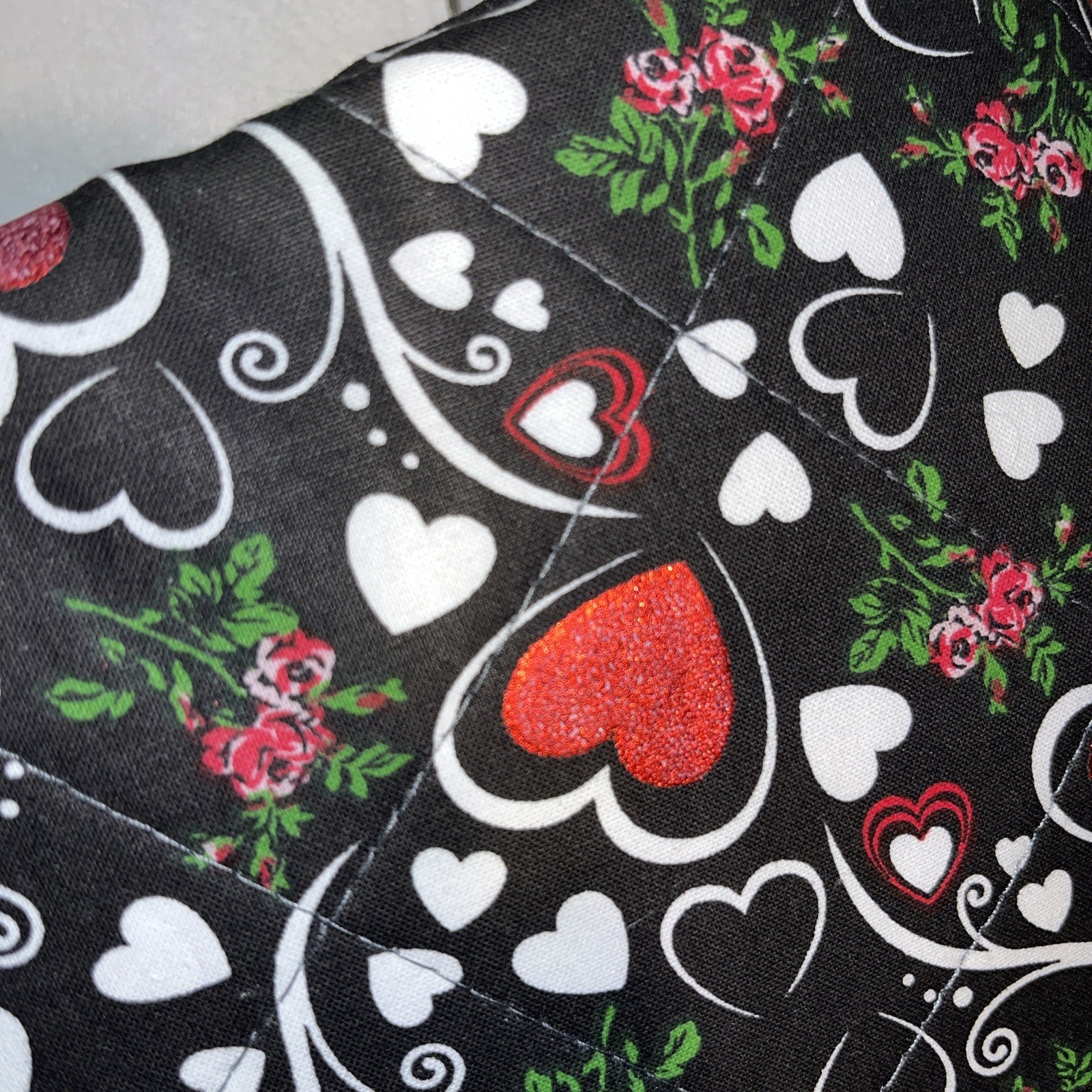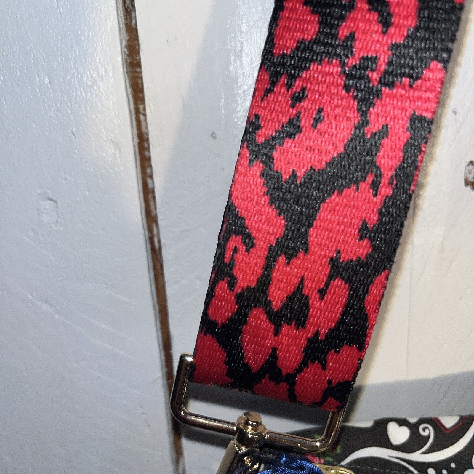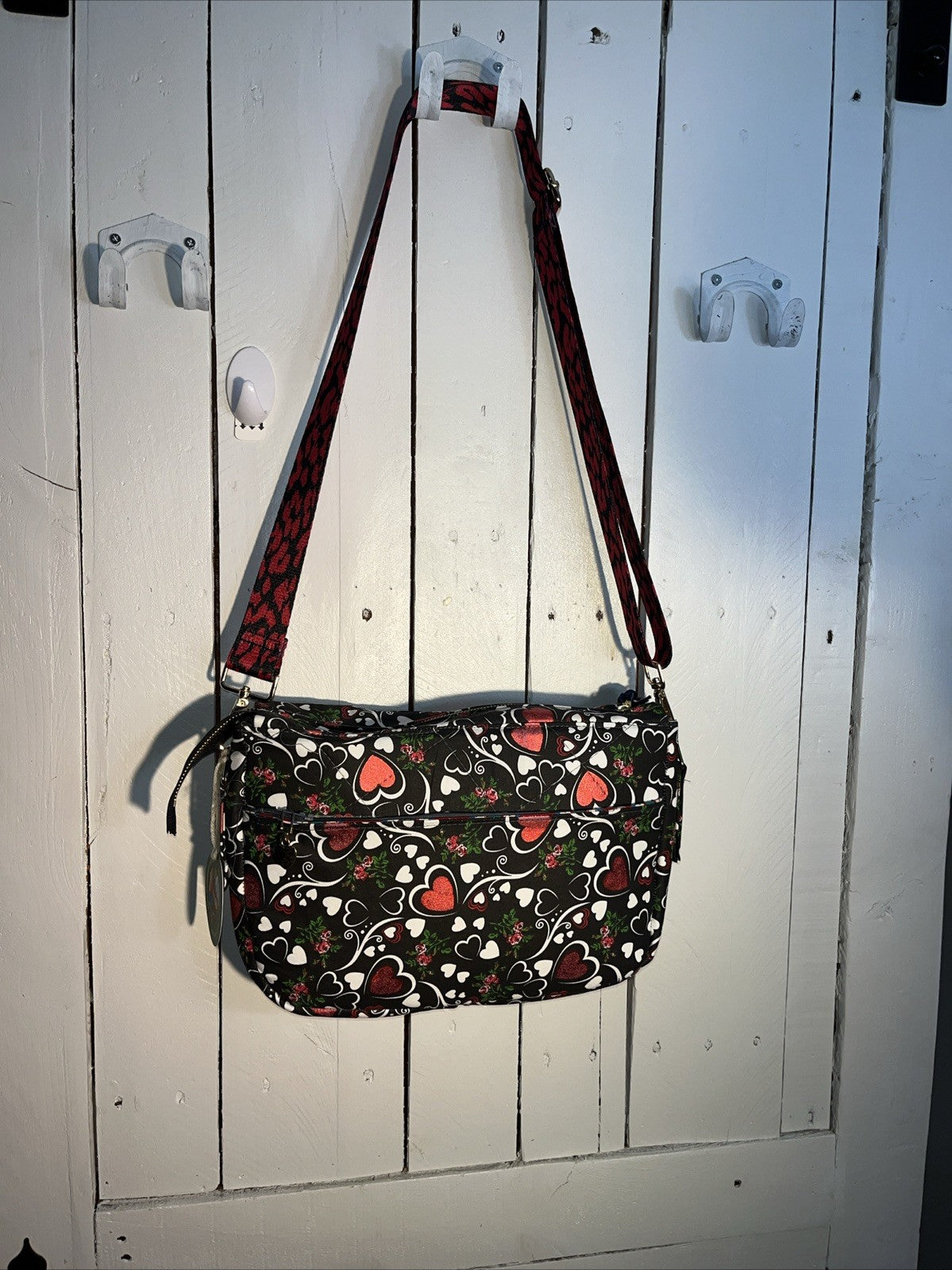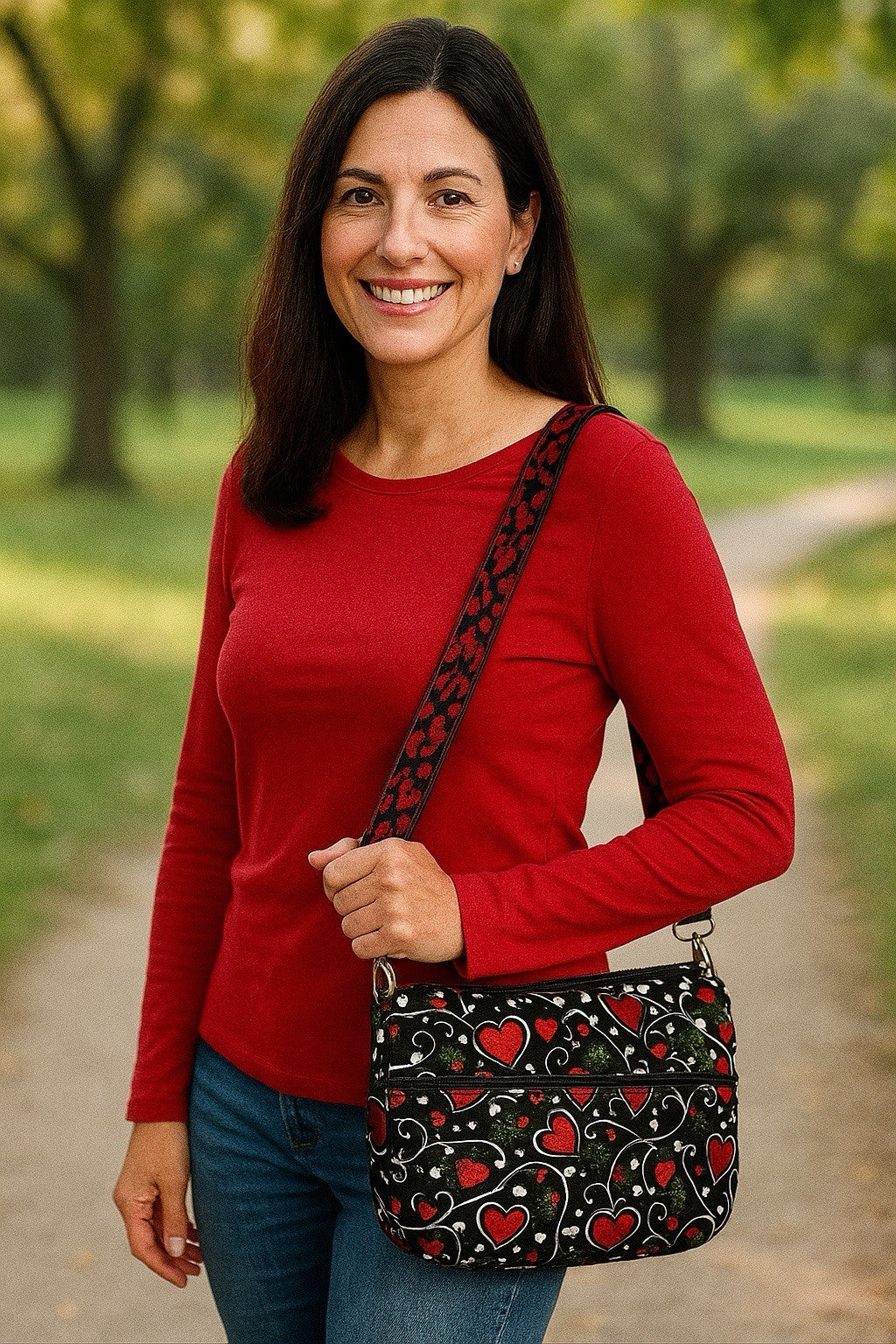 Lidia's Handmade Handbag in Metallic Hearts features a geometric pattern with a zip closure and a medium size of 10 inches in width, 8 inches in height, and 3 inches in depth. The bag is lined with cotton and made with upholstery material, making it durable and stylish. The crossbody strap adds a trendy touch to this eco-friendly handbag, along with inner pockets for organization. Designed by Lidia's bags in the United States, this handbag combines practicality with a touch of heart-themed style, perfect for any fashionable woman on the go.