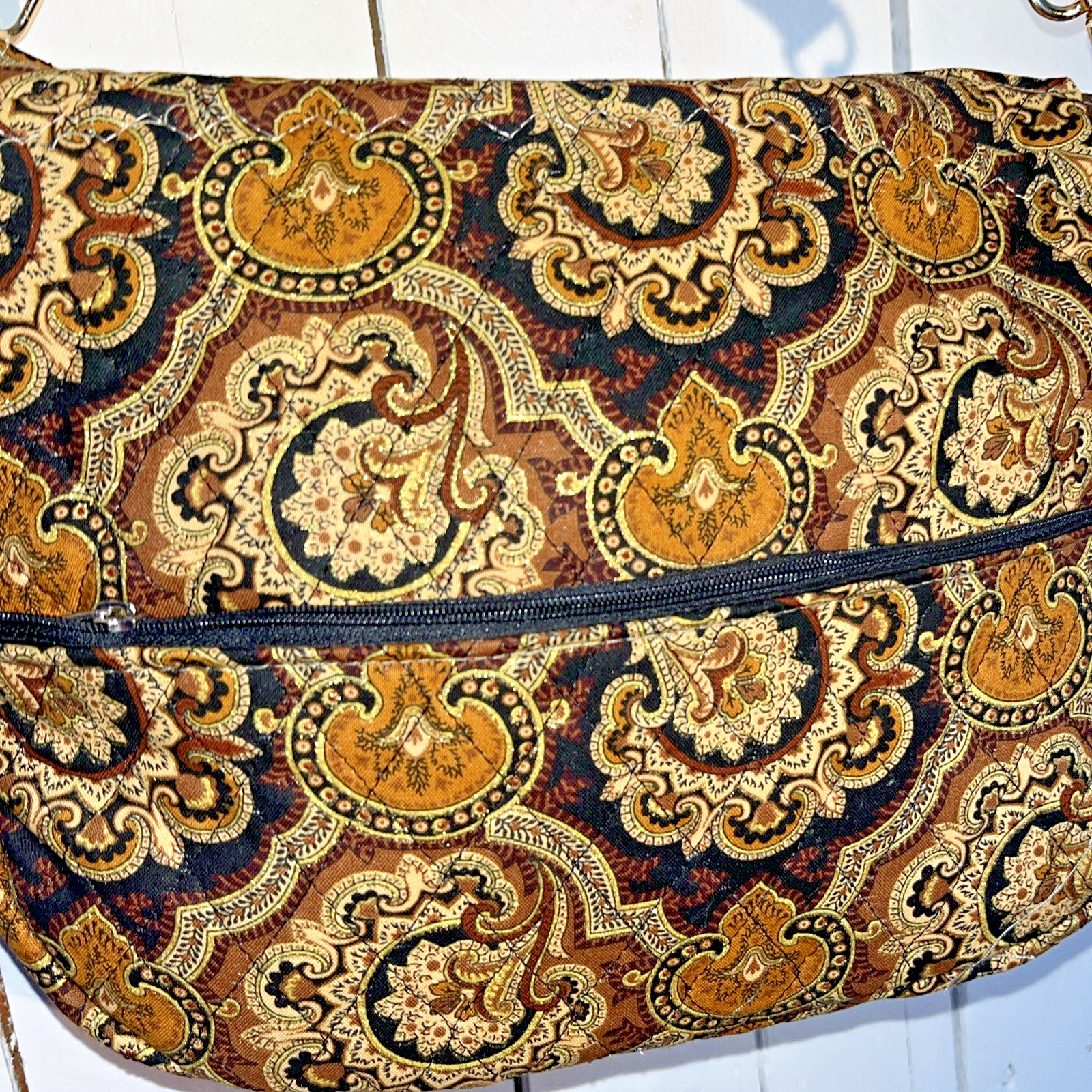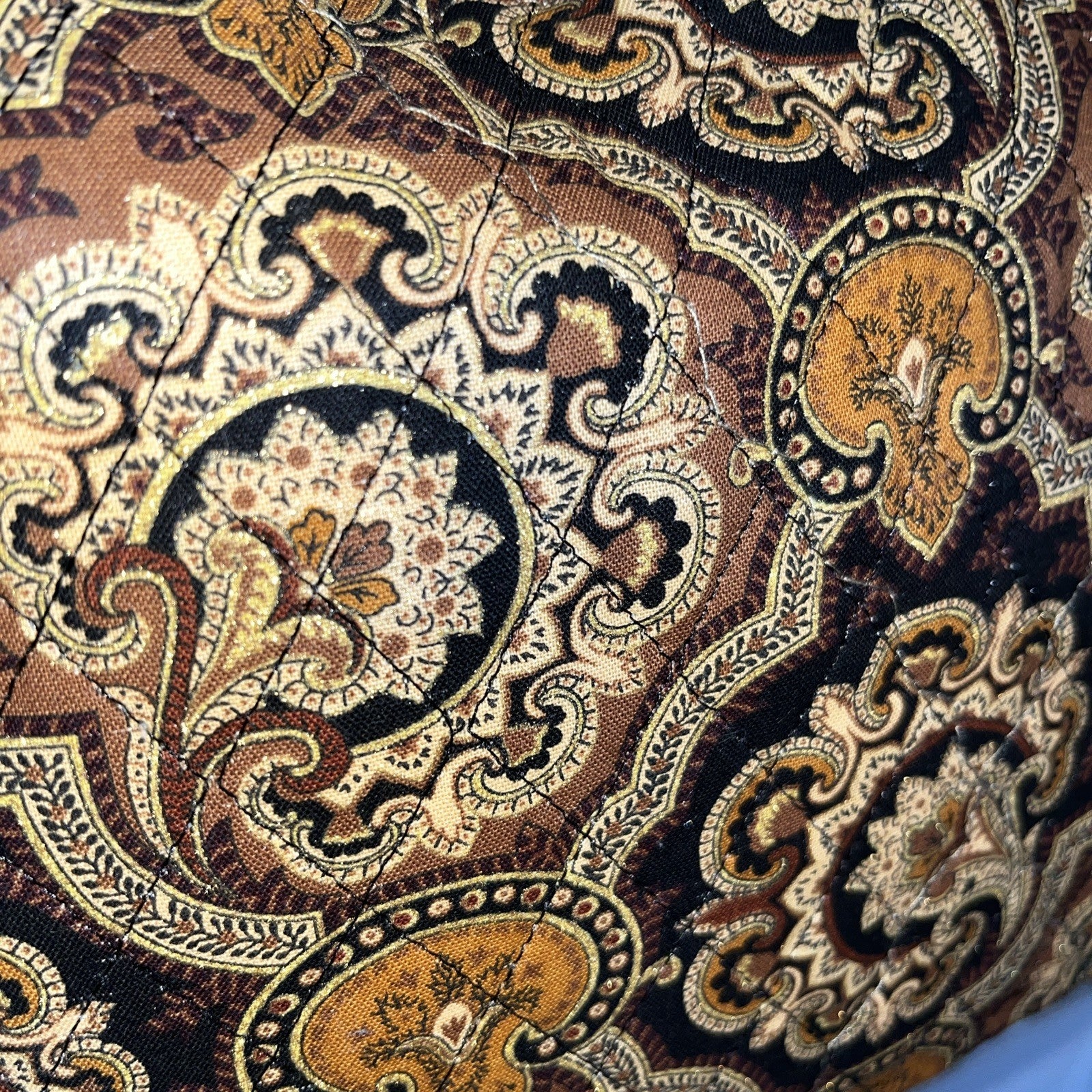 Lidia’s Handmade quilted bag with gold threads and Paisley design in browns