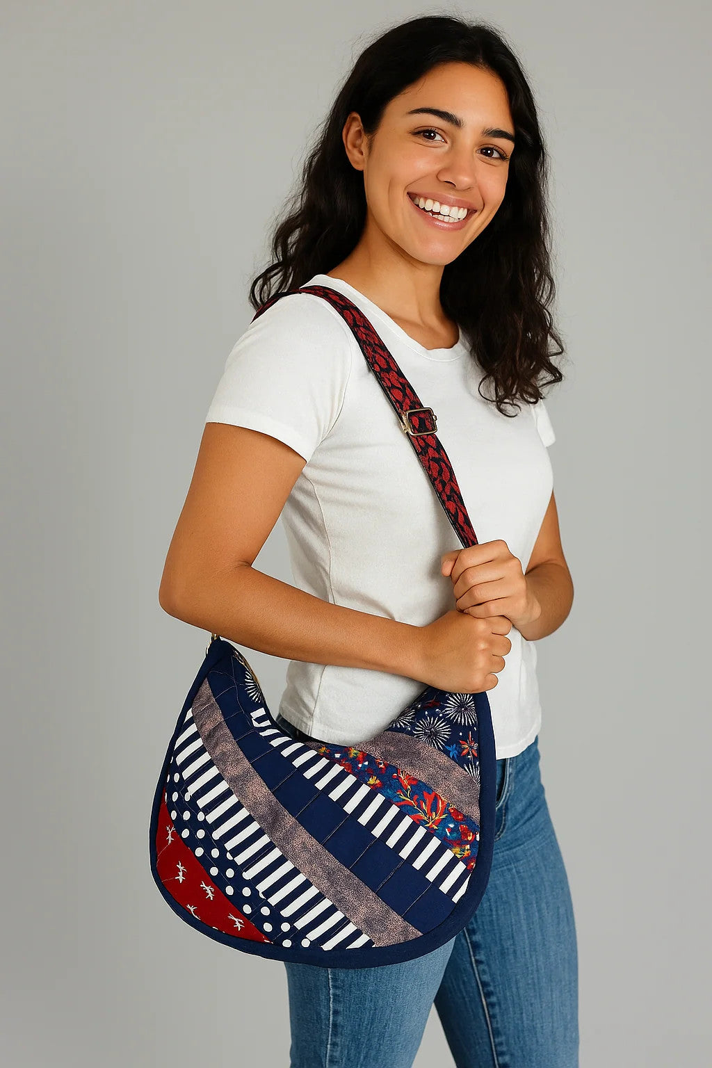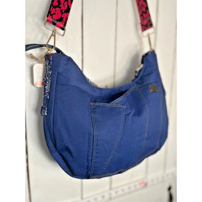 This soft-sided hobo bag is made from upcycled denim and vibrant rescued fabrics, stitched into an easy, eye-catching patchwork. Bold navy stripes, tiny stars, and bright florals curve across the front, giving the bag a festive, playful feel without being loud. It’s lightweight, roomy, and comfortable to wear all day thanks to its wide red-and-black adjustable strap. The zip-top closure keeps everything secure, and the gently curved shape sits naturally at the hip. A great everyday bag if you love color, comfort, and one-of-a-kind handmade pieces.