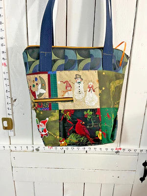Sew Groovy Bag - Handcrafted Christmas Tote / Shoulder Bag This one-of-a-kind Sew Groovy Bag is a lightweight, hand-quilted tote made from a creative mix of rescued cotton and denim fabrics . Each panel features unusual Christmas prints and cute holiday patches , giving it a cheerful, retro look that stands out from mass-produced bags. Features: ✂️ Hand-quilted exterior with unique patchwork fabrics 🎄 Cute Christmas patches and festive details 🧵 Top zipper closure keeps your items secure 🎁 Extra-large external zip pocket for quick access 💚 Fully lined with soft cotton — no polyester 👝 Can be used as a tote or handbag 👩🎤 Comfortable shoulder strap for everyday use 🌿 Eco-friendly — made from upcycled materials Perfect for shopping, travel, or gifting, this eco-conscious holiday tote brings together nostalgic charm and modern function.Sew Groovy Bag - Hand sewn Christmas totes made from rescued fabric `6"W
