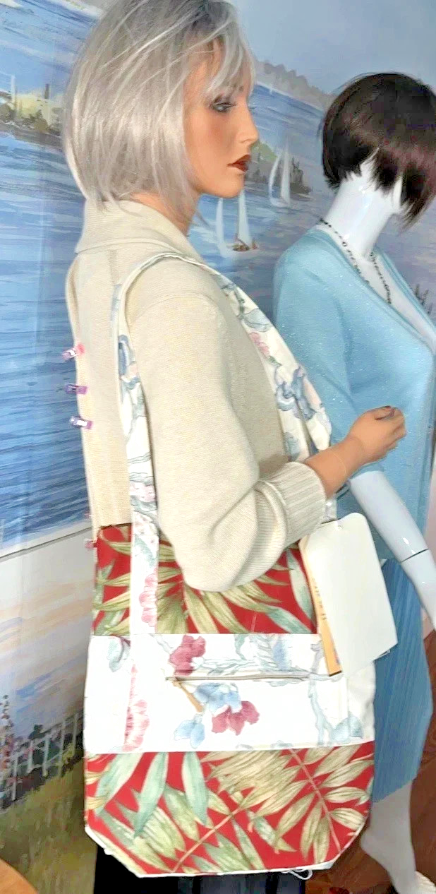 Turn heads with this one-of-a-kind Sew Groovy Bag, a hand-quilted statement piece made from a rich mix of rescued cotton and denim fabrics. Each panel is stitched with care, showcasing vibrant, mismatched florals and vintage-inspired prints that come together in a striking diagonal patchwork design.