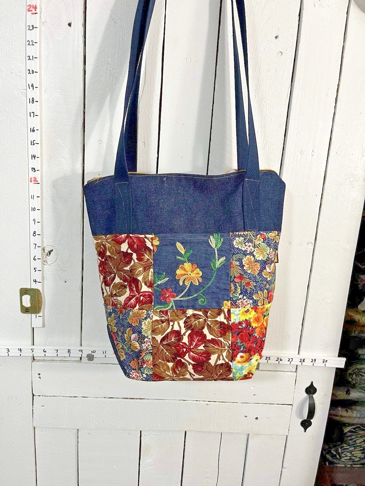 Turn heads with this one-of-a-kind Sew Groovy Bag , a hand-quilted statement piece made from a rich mix of rescued cotton and denim fabrics . Each panel is stitched with care, showcasing vibrant, mismatched florals and vintage-inspired prints that come together in a striking diagonal patchwork design.
