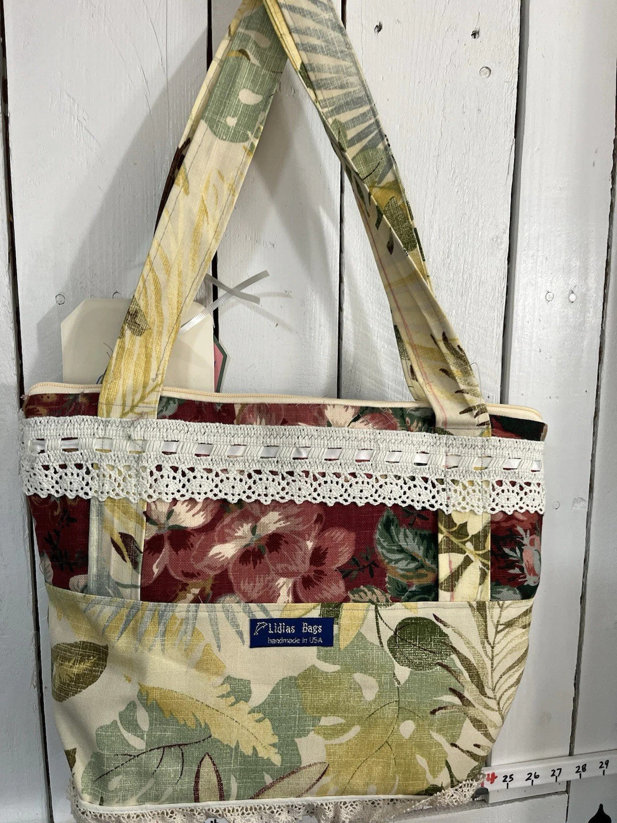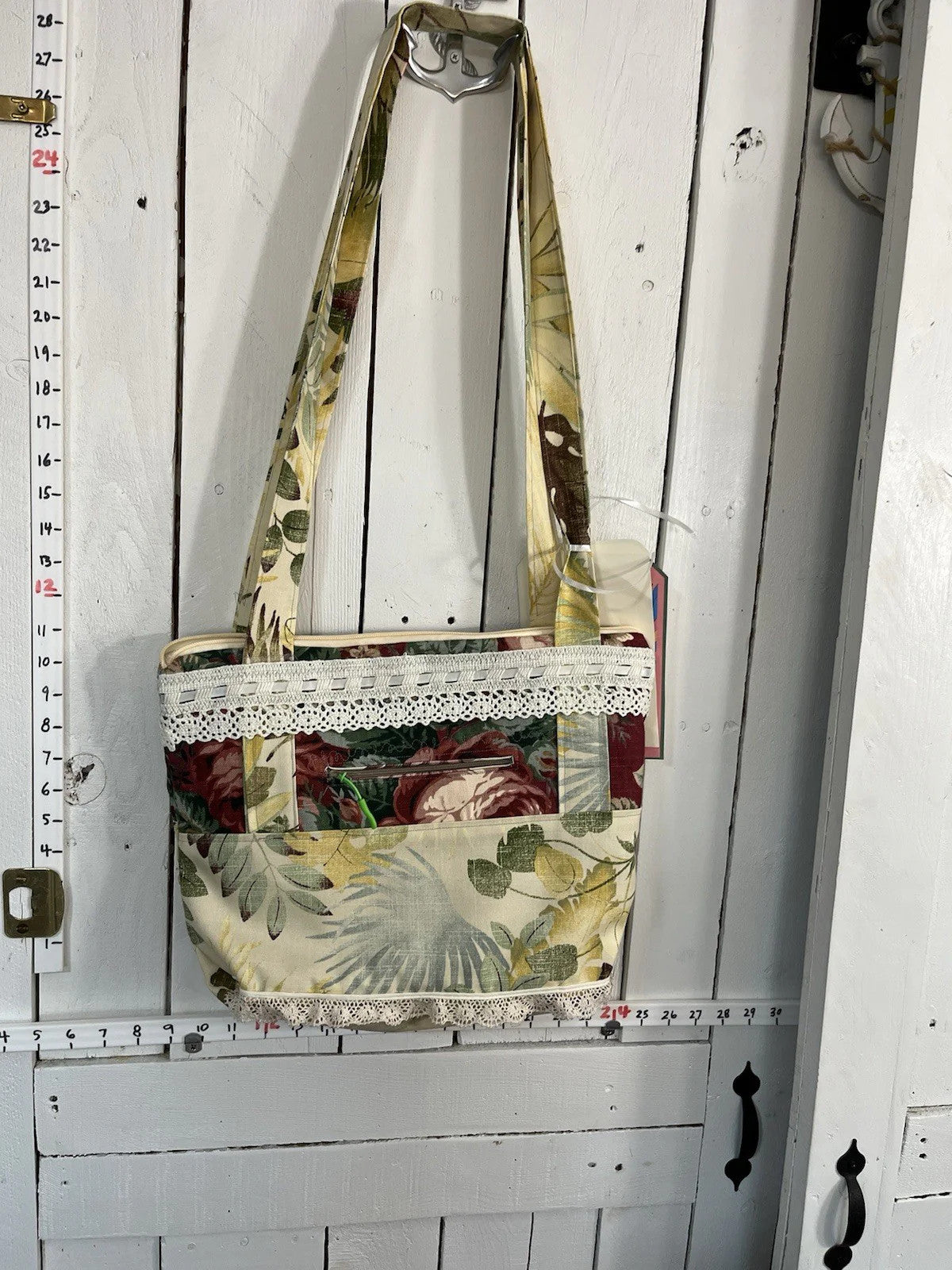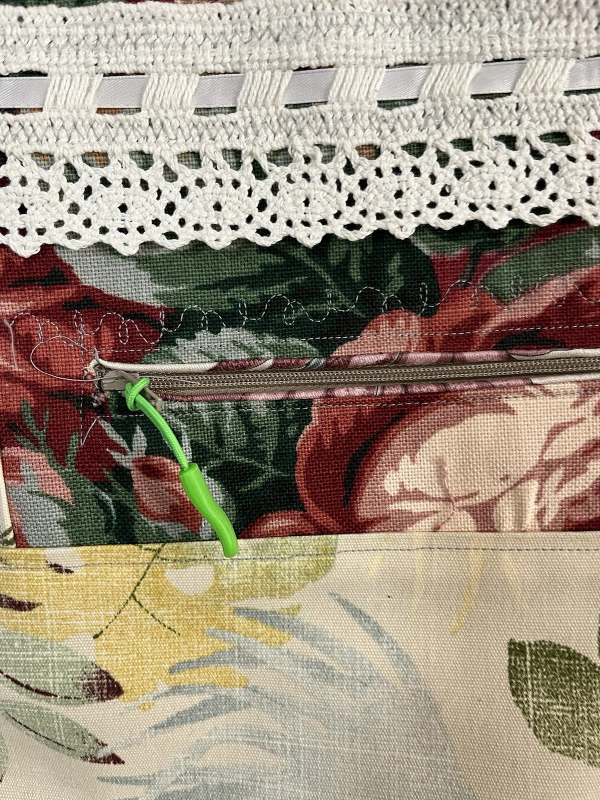 This particular bag has an internal compartmentalized pocket suitable for string, knitting needles, scissors, and other craft items and it has a lace trim also to make it look more crafty