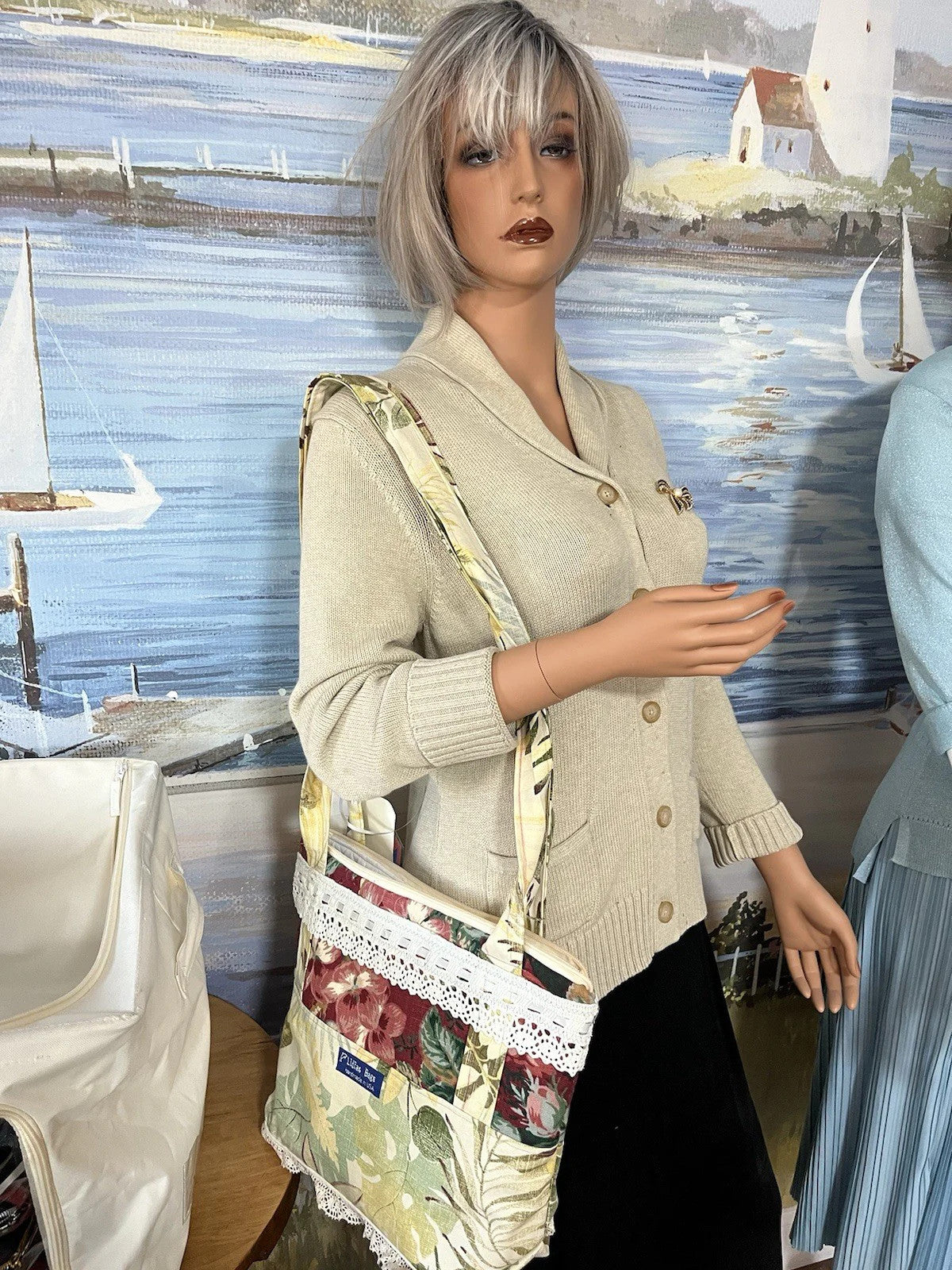 Turn heads with this one-of-a-kind Sew Groovy Bag, a hand-quilted statement piece made from a rich mix of rescued cotton and denim fabrics. Each panel is stitched with care, showcasing vibrant, mismatched florals and vintage-inspired prints that come together in a striking diagonal patchwork design.