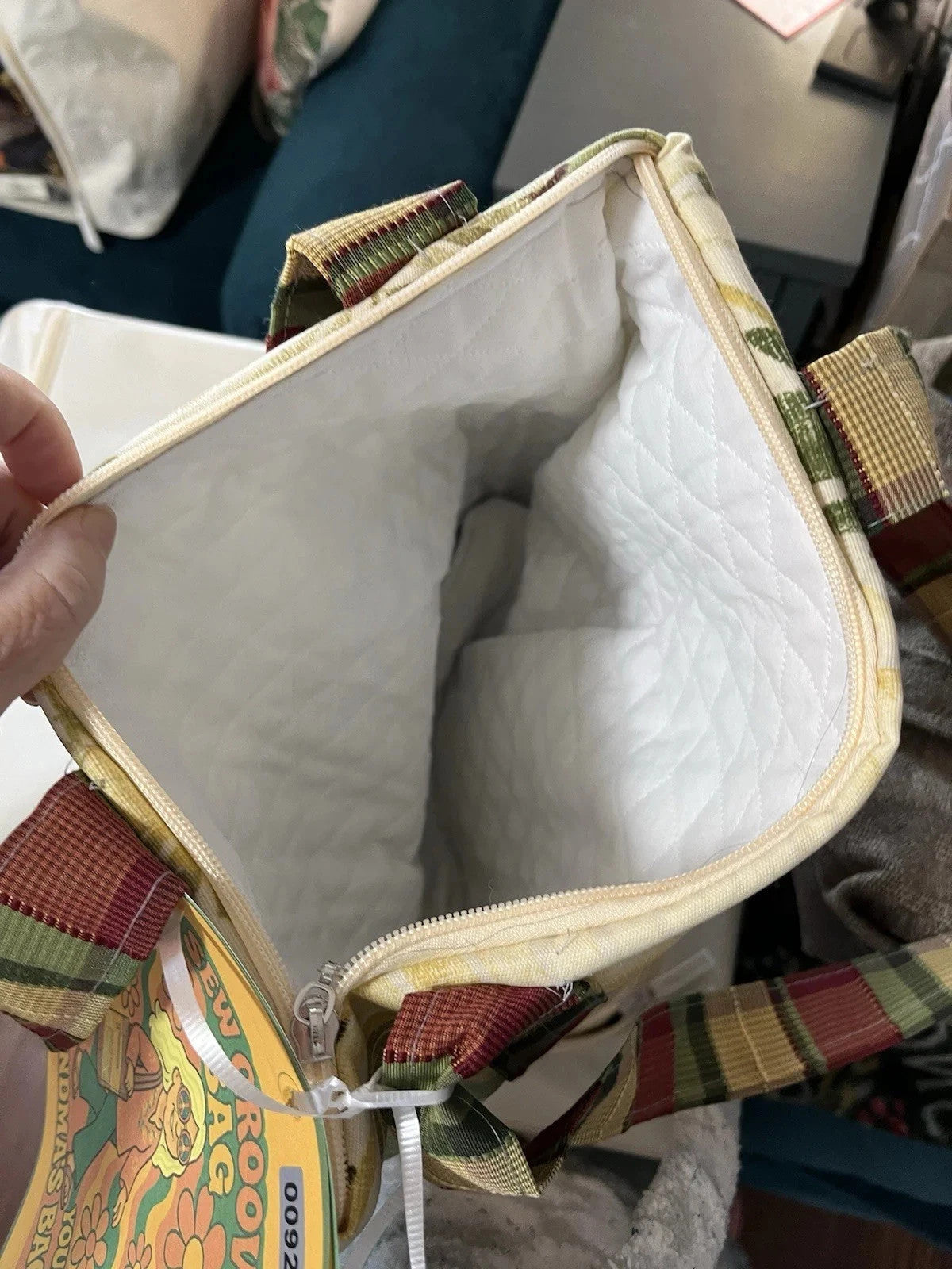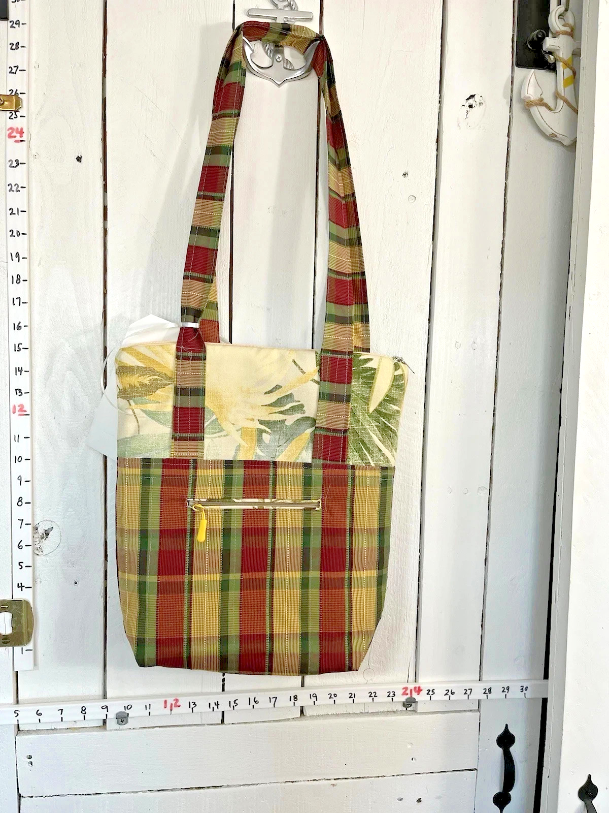 This Sew Groovy bag is the definition of quiet luxury — a handmade, exclusive tote created from discontinued, high-end upholstery fabrics you won’t find anywhere else. The warm plaid in burgundy, olive, and gold is paired with a band of tropical botanical print that runs all the way across the top, giving the bag its signature boutique look. No two bags like this exist — once this fabric is gone, it’s gone forever.