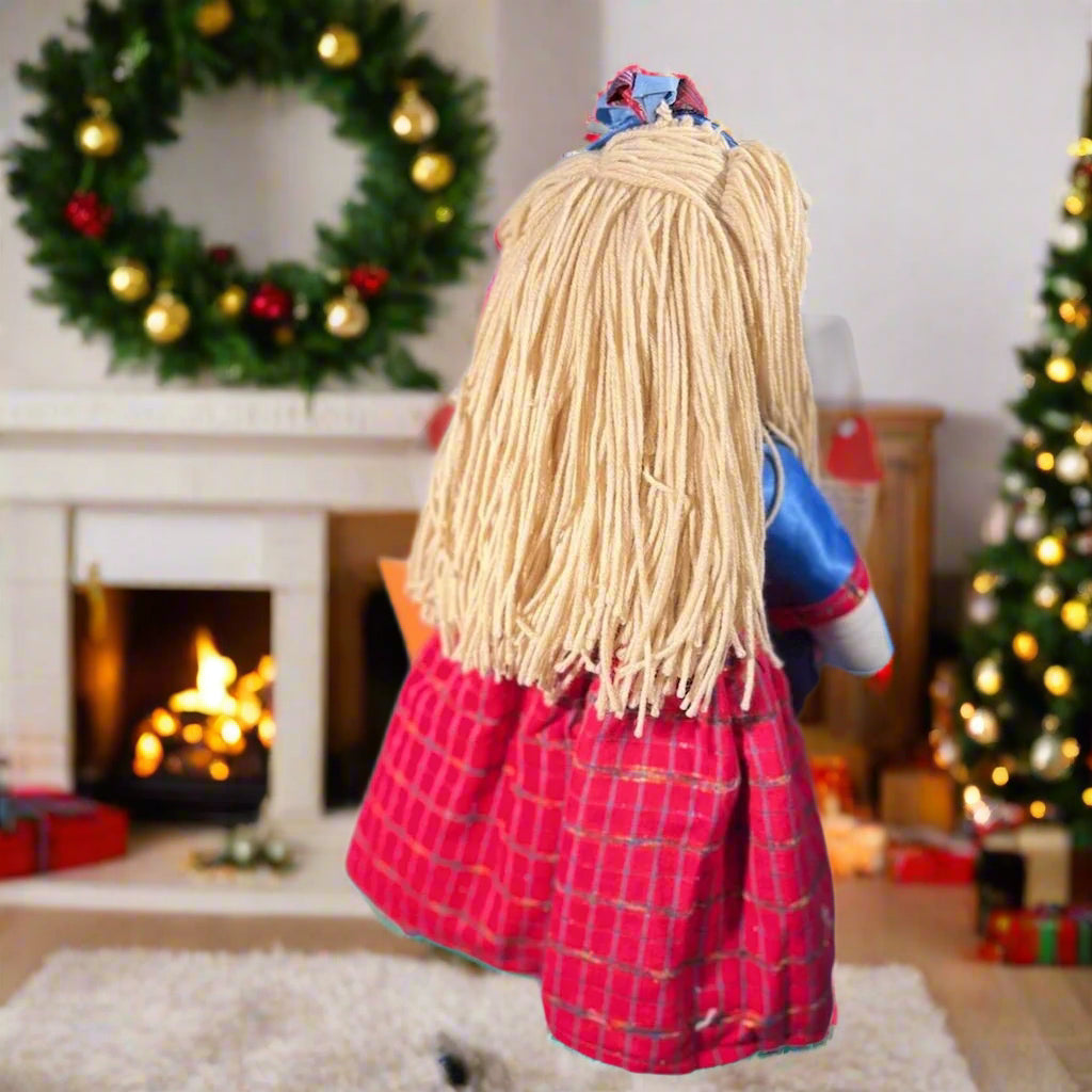 Arabella wears a luxurious dress made from vintage scarlet plaid paired with royal blue satin — and there is only one like it. I never repeat fabric combinations, so once this doll is sold, she is truly gone. Her handmade outfit includes floral trim, a matching hair bow, and careful details you can feel in every stitch.