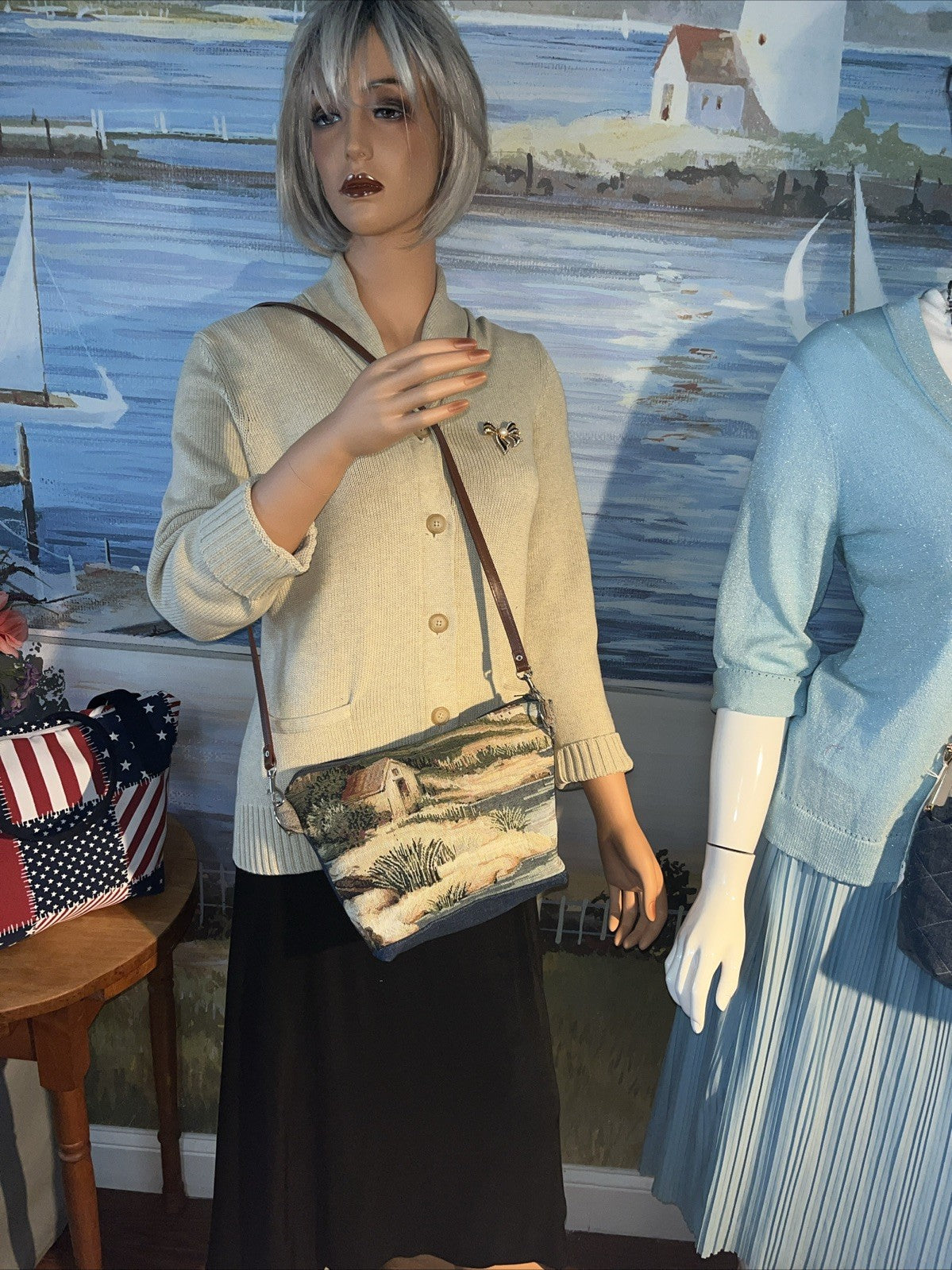 Step out in charming vintage style with this delightful tapestry shoulder bag. Size 12" by 9" you Perfect for adding a touch of nostalgic seaside flair to your ensemble, this pre-owned bag features a beautiful tapestry weave showcasing a captivating beach and seashore scene. Intricate detailing depicts an open umbrella, suggesting leisurely days by the water, along with subtle nautical elements that evoke coastal charm. This unique accessory is ideal for carrying your essentials with distinctive personality.